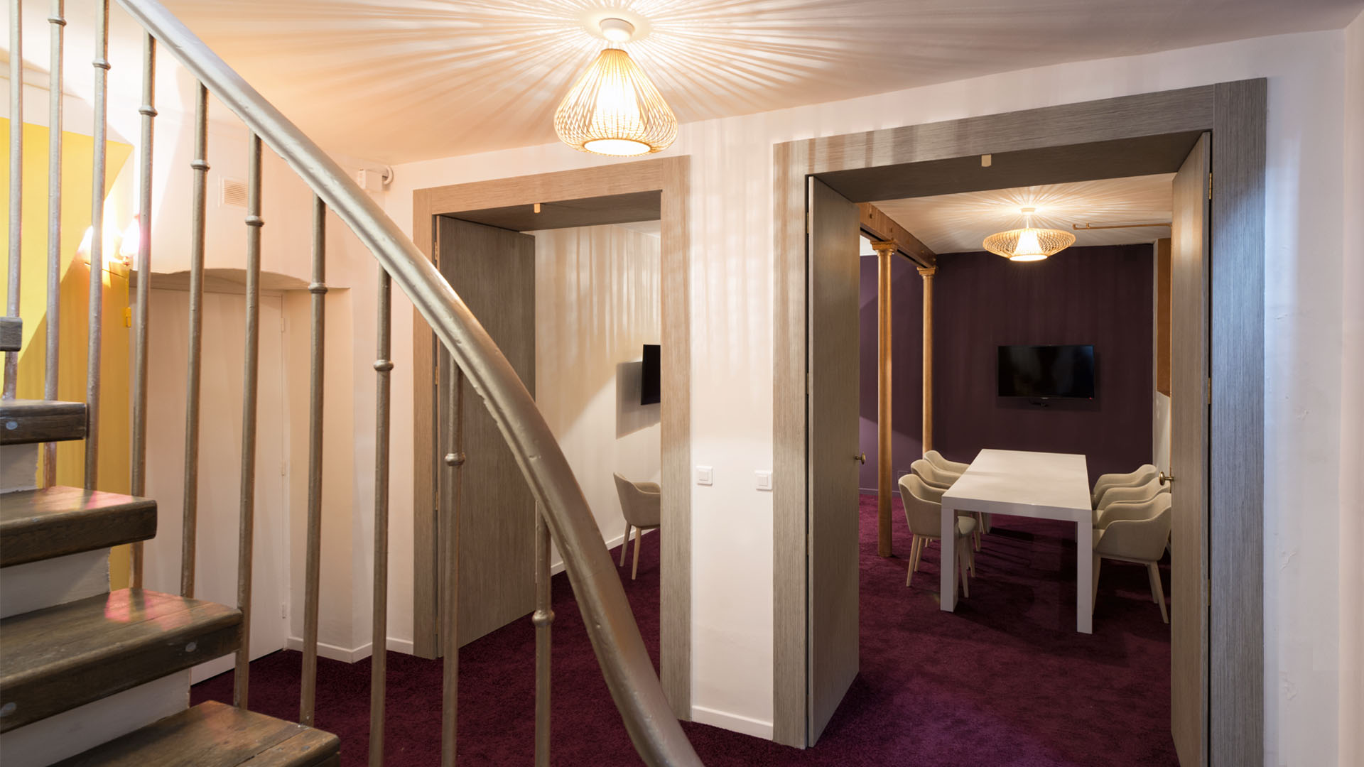 Pour rénover ce local en espace de coworking, les espaces ont été répartis sur deux niveaux : au rez-de-chaussée, l’espace de travail et la cuisine, au sous-sol les salles de réunions et conversations sous l’escalier. Une attention particulière a été porté à l’intégration des éléments techniques permettant une utilisation optimale notamment en termes d’accès internet, vidéo et contrôle d’accès.
